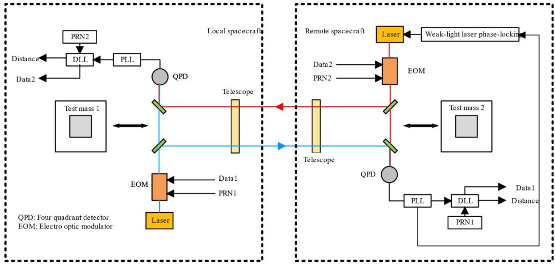 空间引力波探测利用星间激光干涉技术测量引力波引起的星间pm级位移波动,进而反演引力波信息。受限于卫星载荷重量及功耗,激光干涉测量系统高度集成多种功能。在完成干涉测距的前提下,需加入绝对距离测量与激光通信、时钟噪声传递等功能。为有利于主干涉信号的提取,保证干涉测量精度,系统仅采用约1%激光载波功率进行激光通信。因此,需以激光干涉系统为依托,进行激光通信系统方案设计,确定调制频率、调制深度、伪随机码等相关参数,并完成方案原理验证。