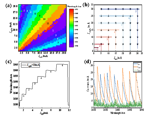 围绕如何提升LUT构建效率以及波长调谐时的功率稳定性,上海大学特种光纤与光接入网重点实验室研究团队对MG-Y激光器的调谐特性进行深入研究,设计了一种具有普适性的电流扫描框架,以此高效且准确地确定平滑的波长调谐路径,然后通过调节相位区电流(Iphase),实现了波长细调谐功能。同时提出了一种自适应功率校准算法,保证激光器在波长调谐时功率也能保持相对稳定。