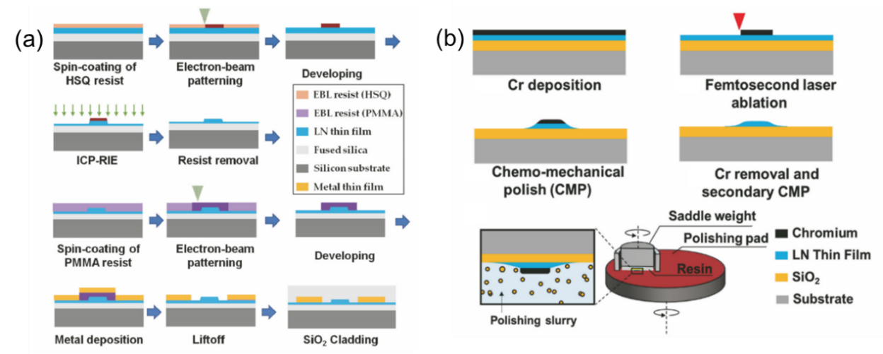 图1 (a)利用电子束曝光结合离子束刻蚀的方法制备薄膜铌酸锂光子结构的工艺流程示意图;(b)飞秒激光直写辅助化学机械抛光(PLACE)制备铌酸锂光子芯片的工艺流程图
