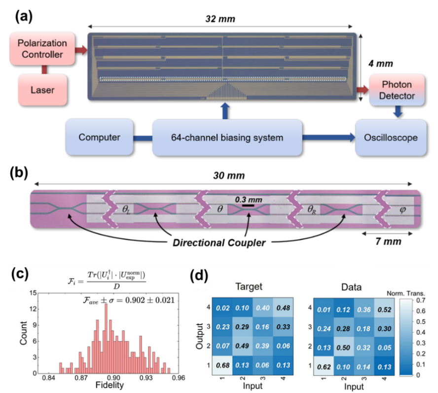 图2 基于薄膜铌酸锂平台制备的4×4可编程线性光子芯片[6]。(a)任意SU(4)变换矩阵;(b)MZI单元的内部结构;(c)200个随机矩阵的测量保真度的直方图;(d)其中一个矩阵的理论与实验结果的对比