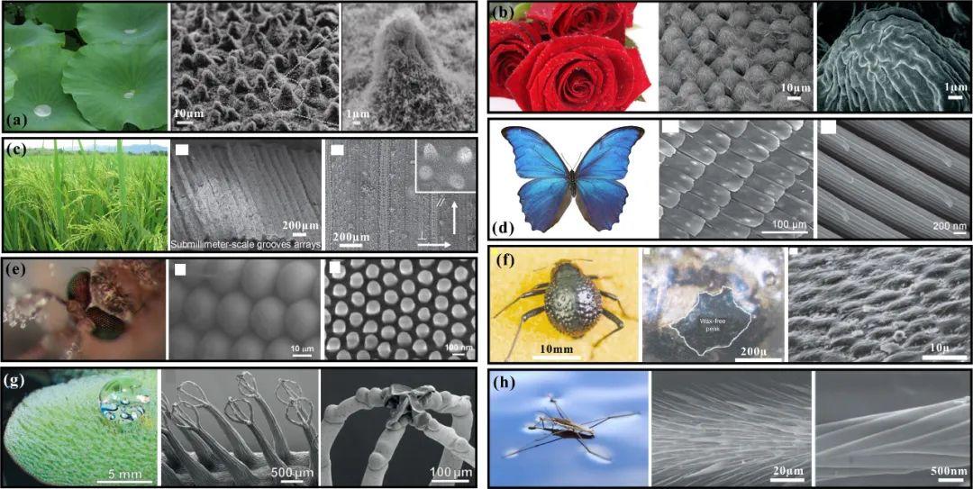 浸润性是固体表面基本的物理化学性质之一。自然界中许多动植物都进化出了特殊的浸润性表面以适应所处的复杂生存环境,例如荷叶具有自清洁功能、水黾能够在水面上跳跃、蚊子眼能够在潮湿环境中防雾、昆虫会滑落进猪笼草口袋中等(图1)。研究发现,固体材料表面的浸润性主要由其化学组成和微观几何形貌共同决定。具有特殊浸润性的表面在能源利用、化工制造、医疗健康、****等应用领域发挥着重要作用,因此特殊浸润性尤其是浸润性(也即超浸润性“superwettability") 成为了当前微纳制造领域的热点研究方向之一。