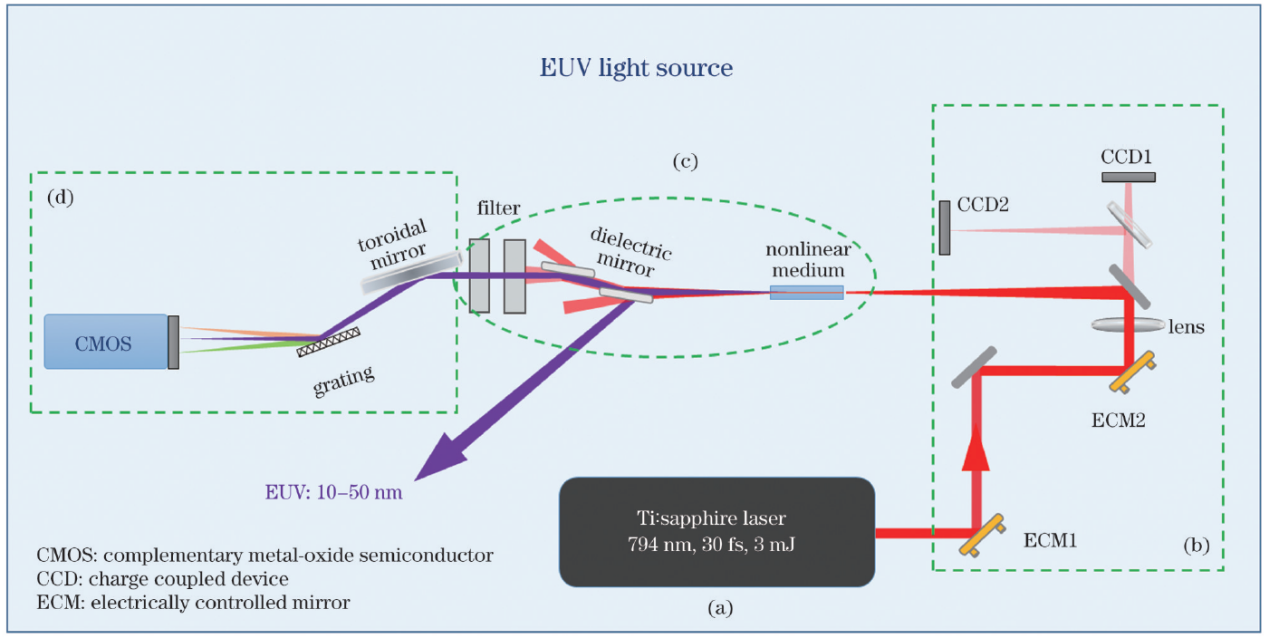 图1 实验装置示意图。(a)钛宝石光源系统;(b)光束稳定控制系统;(c)EUV 发生及过滤系统;(d)EUV 光源检测及光谱仪系统