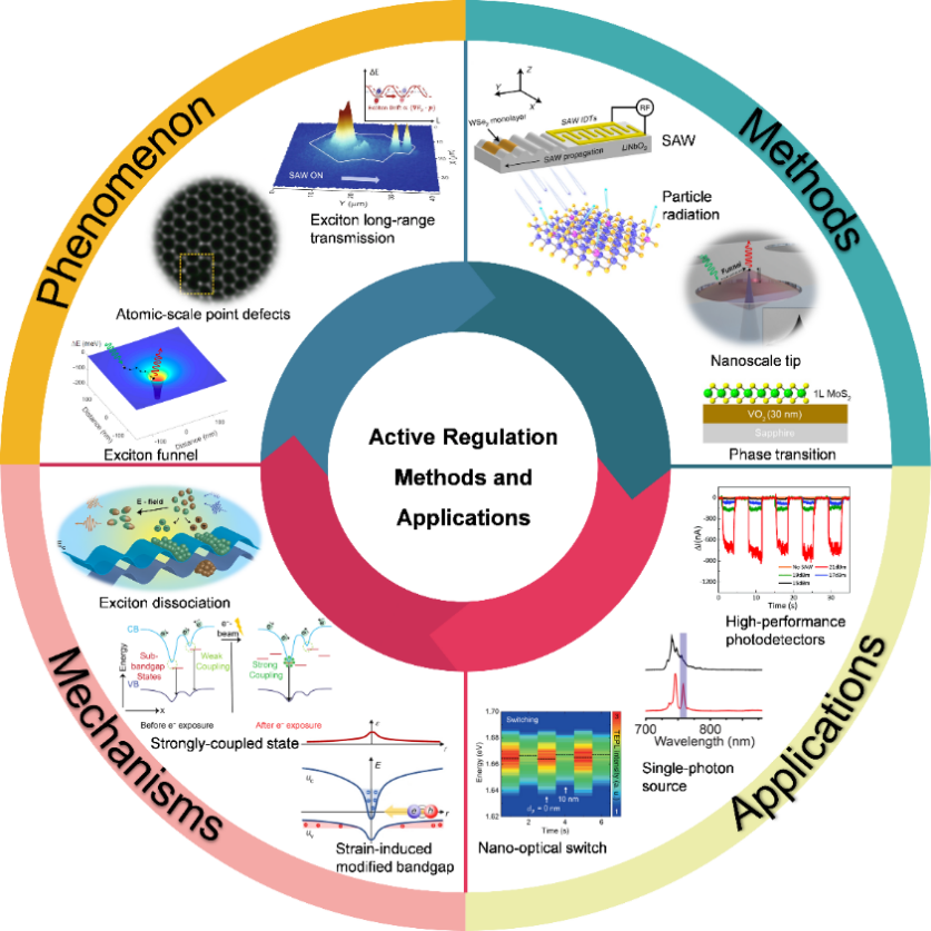 图1 二维TMDs激子主动调控方法、实验现象、物理机制及应用