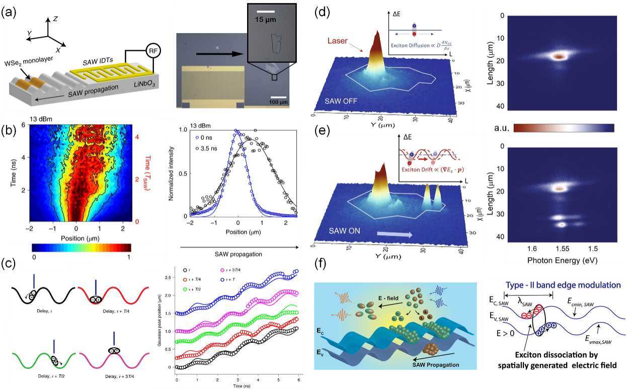 图2 SAW调节二维激子传输。(a)SAW器件示意图;(b)单层WSe2的时空映射(左图)及相应剖面(右图);(c)不同延迟时的光生激子示意图(左图)以及相位同步演化的高斯峰位置与延迟时间关系(右图);在SAW关闭(d)和开启(e)时,双层WSe2的空间PL映射(左图)和PL图像(右图);(f)由压电场诱导的导带和价带势能波动示意图(左图)以及II型能带调制示意图(右图)
