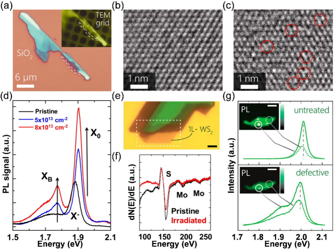 二维TMDs 半导体材料的光致发光(PL)光谱对缺陷具有高灵敏性。Chow等使用等离子体辐照WS2单层,由于电子束德布罗意波长较短,可以引入原子尺度缺陷。图3(a)和图3(b)分别为单层WS2的显微图像和未经等离子体处理的高分辨透射电子显微镜(HR-TEM)图像,可以观察到高质量单层WS2高度规则的晶格结构,证明其无明显缺陷。图3(c)为经过大约10 s等离子体辐照处理后单层WS2的HR-TEM 图像,圆圈标示了在晶格中引入的原子尺度点缺陷,与其他晶格点对比相对较暗,表明可能产生了S或W原子空位。此外,辐照后单层WS2[图3(e)]的PL光谱中存在与缺陷相关的光谱峰,能量比中性激子峰能量低~0.1 eV[图3(g)],该缺陷PL 峰随着缺陷增加而增强。如图3(g)所示,实线光谱来自PL积分图像中实心圆圈内的区域,虚线光谱来自由虚线圈出的区域,等离子体处理持续约30 s,比例尺为2 μm。研究表明,另一种类型的电离辐射——α粒子与二维材料相互作用也会产生类似现象。如图3(d)所示,α粒子辐照后,PL谱中与缺陷相关的束缚激子XB出现,强度与辐照剂量成正比。值得注意的是,自由激子X0的PL强度也有所提高,可能是由于辐照引入的缺陷提供了电子-空穴对复合新路径。基于纳米俄歇(Nano-Auger)电子谱可进一步确认材料表面产生的缺陷主要为S空位:辐照后俄歇电子谱中硫(S)峰强度降低[图3(f)]。