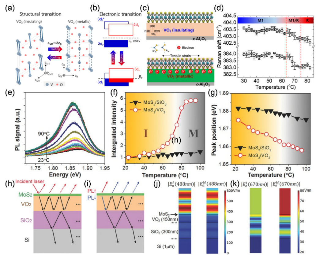 相变材料为二维TMDs半导体材料物理性质的调控提供了一种无须化学或机械处理的新途径,操作简单,且可通过外部温度控制实现可逆调节。典型相变材料VO2在不同温度或光场下可以从绝缘体相(M1相)转变为金属相(R相),与二维TMDs半导体异质集成可有效调控二维激子动力学与光电特性。