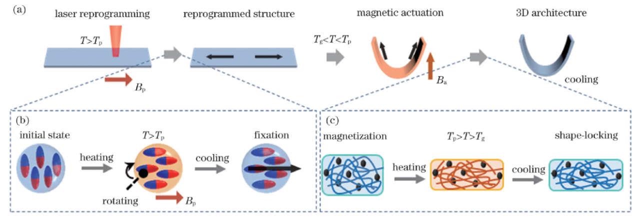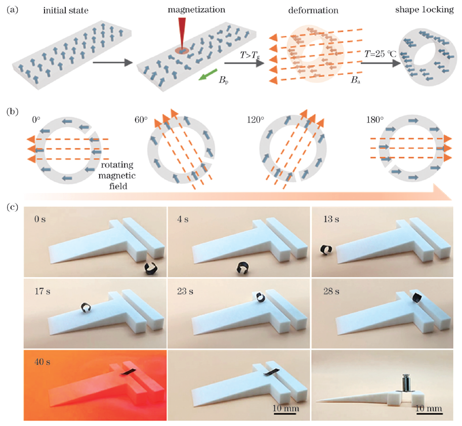 图1 RM-SMC机器人磁畴重编码及变形原理。(a)RM-SMC机器人重编码、加热变软、磁致变形和形状保持过程;(b)磁性微囊中磁性颗粒偏转示意图;(c)机器人基质变形、形状锁定示意图。Bp:旋转磁场;Ba:旋转磁场