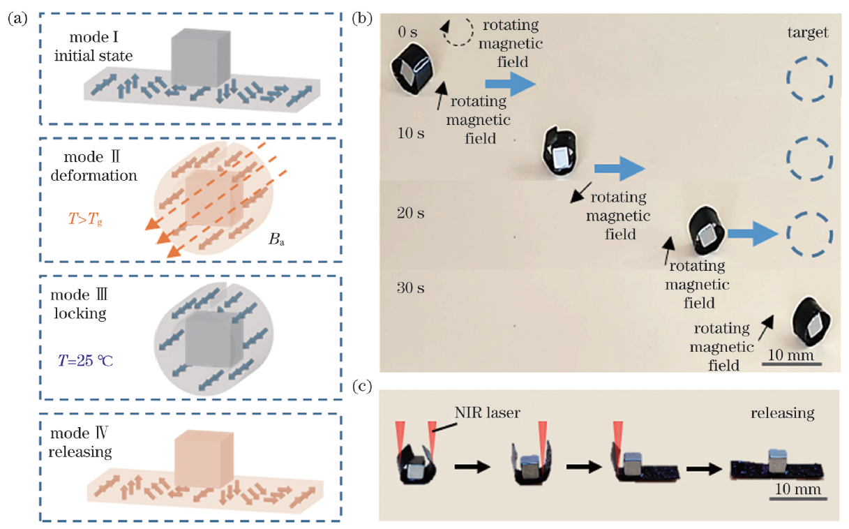 图3 载物机器人。(a)载物机器人的货物放置、磁驱变形、货物锁定和货物释放过程;(b)载物机器人在旋转磁场下的定向运输过程;(c)载物机器人货物的释放过程