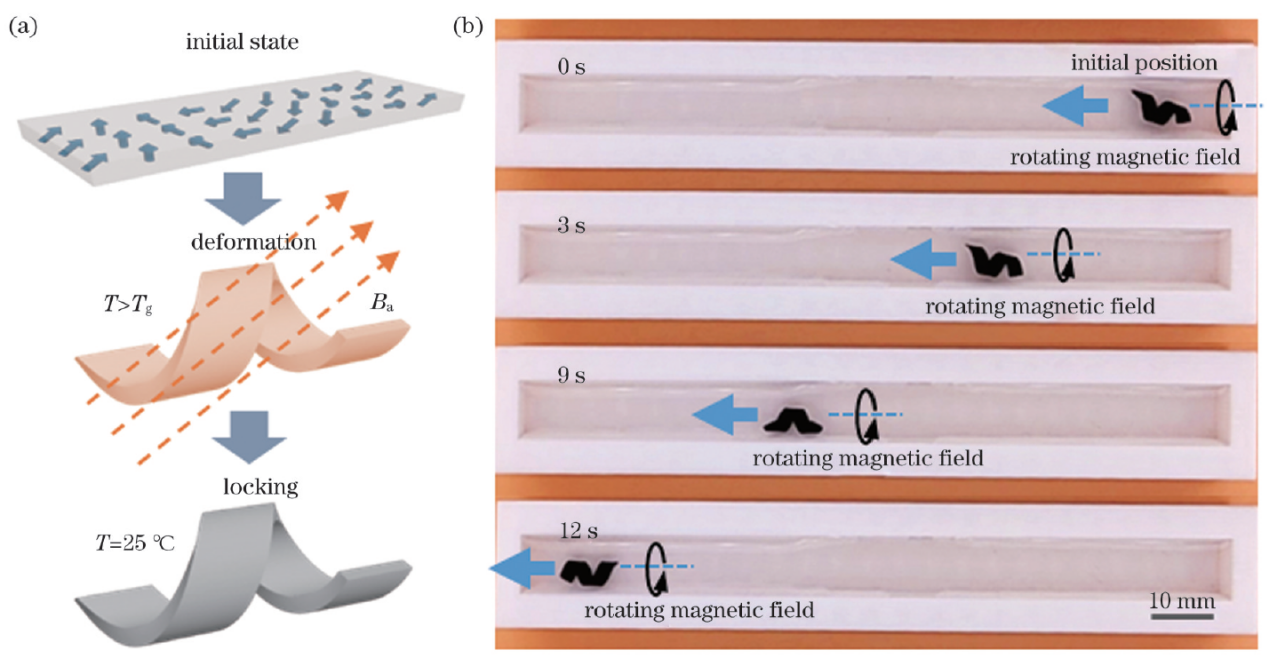 图4 螺旋机器人。(a)螺旋机器人的加热磁致变形和形状锁定过程;(b)螺旋机器人在旋转磁场下在水中驱动过程