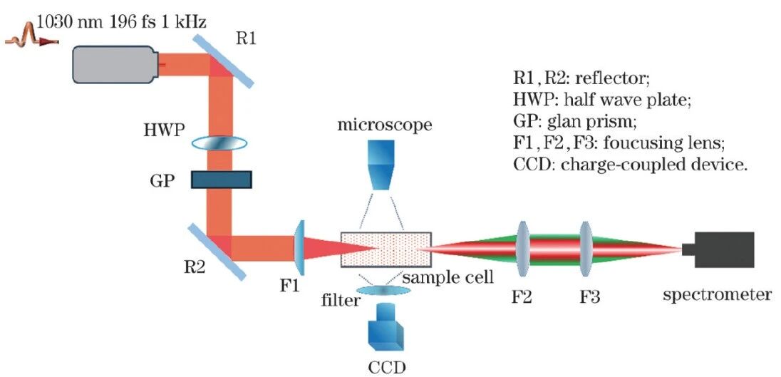 针对传统共振增强方式存在的能量损耗问题,上海光机所王铁军研究员团队与上海理工大学袁帅副教授团队提出了一种新策略:利用近红外飞秒激光在掺杂纳米金颗粒的纯水中形成光丝,并借助光丝辐射产生的超连续谱来覆盖纳米金的等离子体共振波长,从而实现间接激发与增强非线性响应。实验装置如图1 所示,实验中采用中心波长为1030 nm、脉冲宽度约196 fs的掺镱飞秒脉冲激光器作为光源,通过外部聚焦使激光在样品池内诱导形成光丝,并结合光谱测量与显微成像系统,分别对等离子体通道特性、光谱展宽行为及气泡动力学过程进行了系统研究。