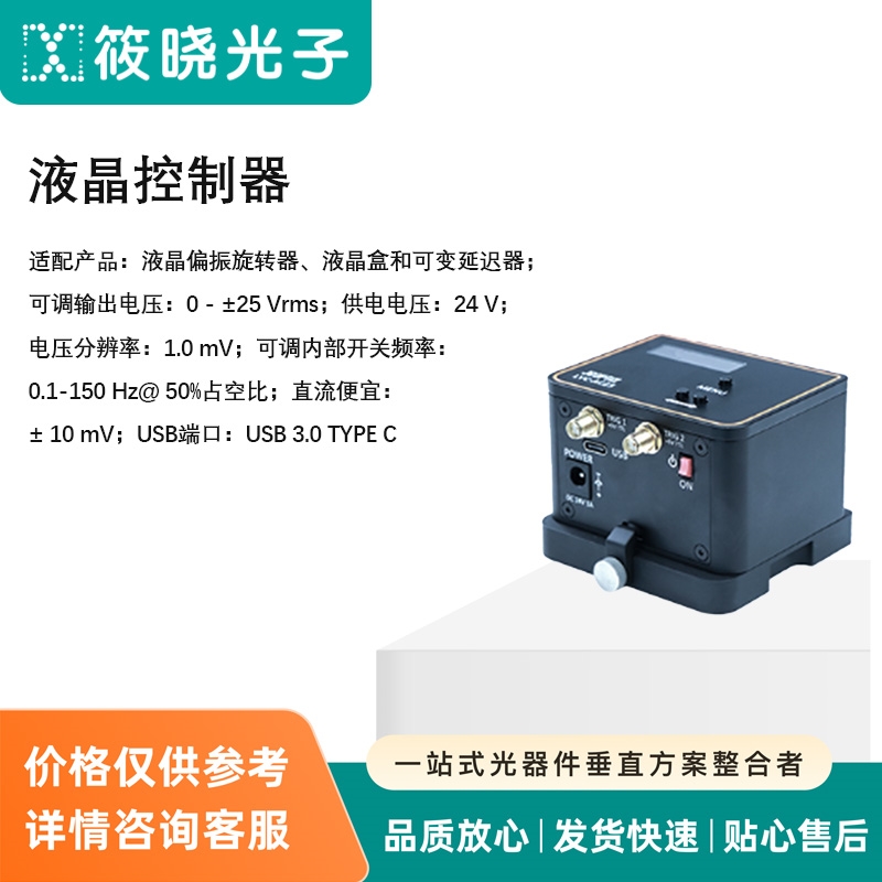 我们提供适配可调液晶相位延迟器、偏振旋转器和液晶盒的控制器,可输出电压0 - ± 25 Vrms,输出频率500 Hz - 10 kHz(50%占空比),Max. 输出电流50 mA。控制器支持外部信号触发控制器电压输出或控制器输出触发信号,可实现与其他设备配合使用。控制器可通过BNC与可调液晶相位延迟器、偏振旋转器和液晶盒连接;通过USB TYPE C与电脑连接,方便快捷。