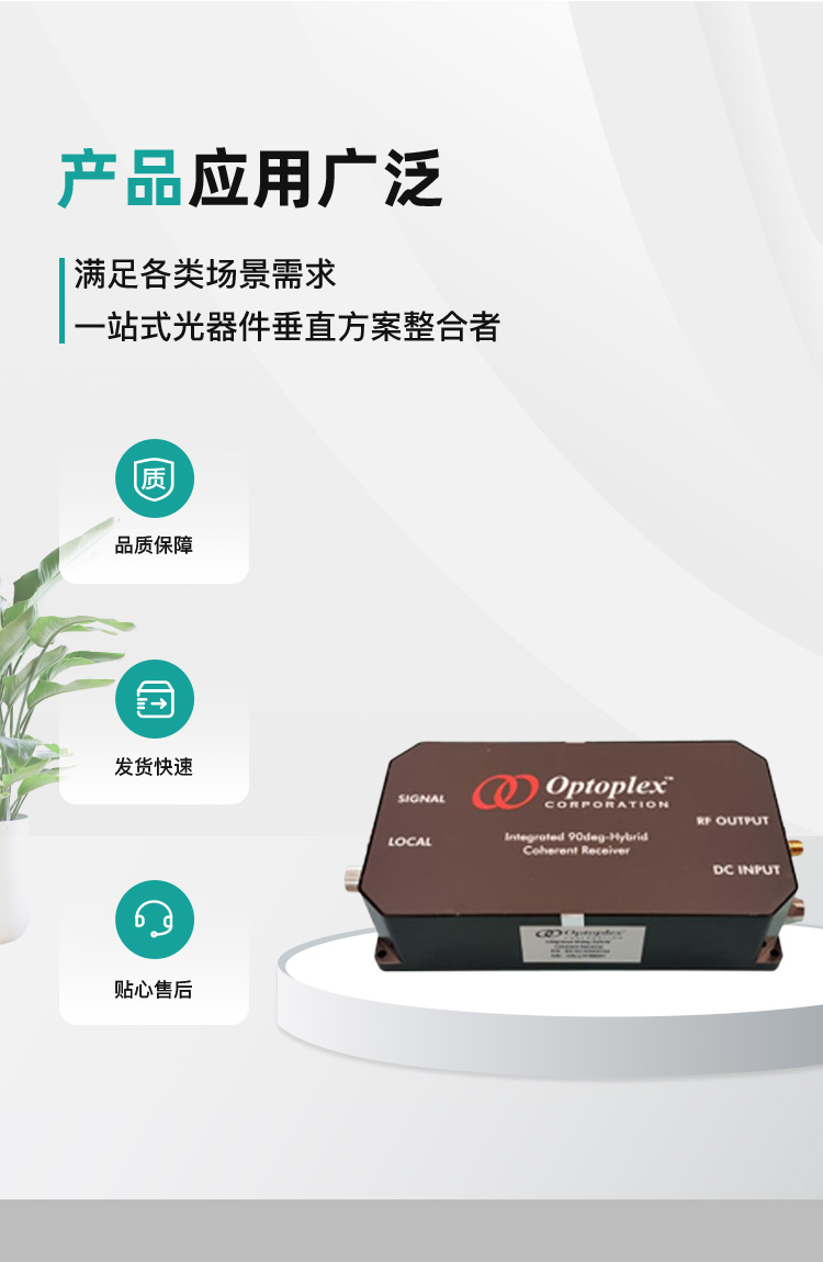 Optoplex的基于自由空间微光学的无源90°光混频器,已广泛应用于光通信中的40Gbps和100Gbps相干传输系统。除了90°光混频器、2x4相干混频器和2x8相干混频器外,Optoplex还开发和供应了集成的40G和100G相干接收器。