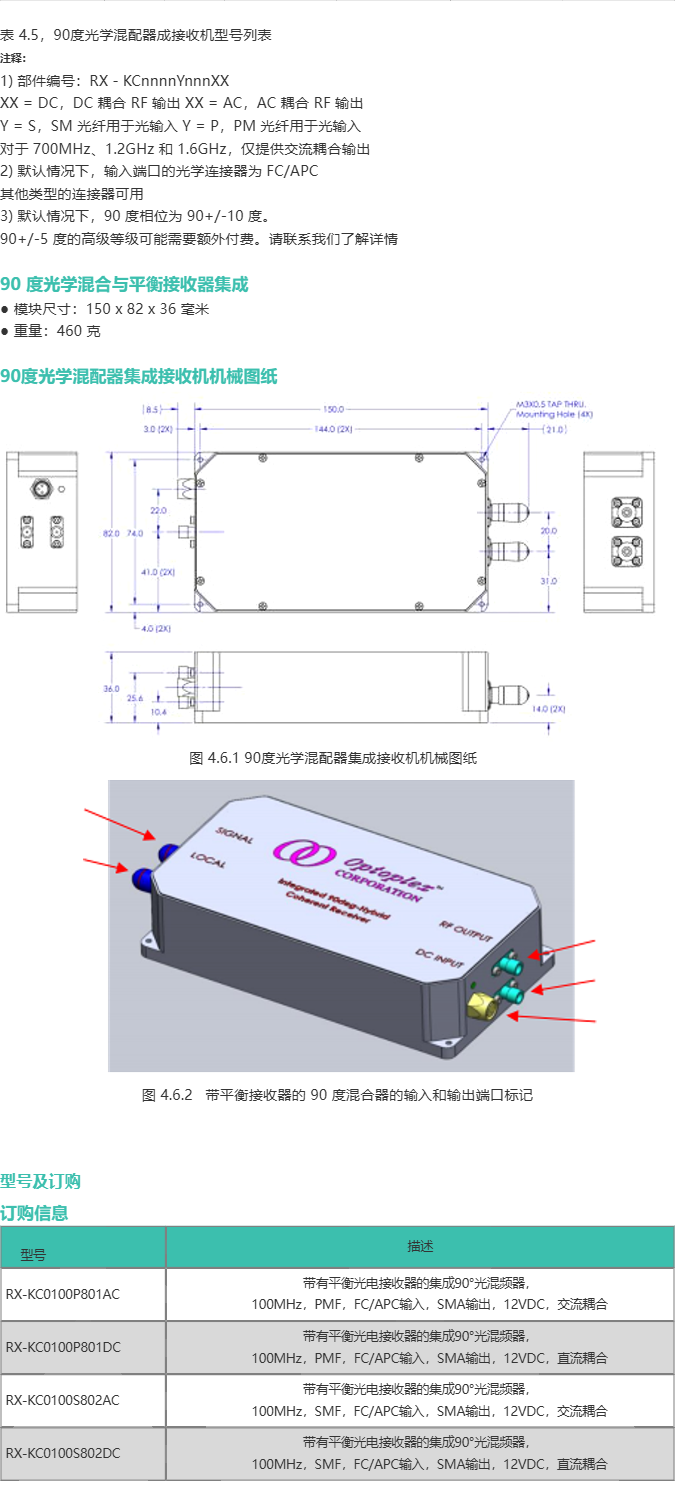 带有平衡光电接收器的集成90°光混频器,SMF,直流耦合(信号解调)