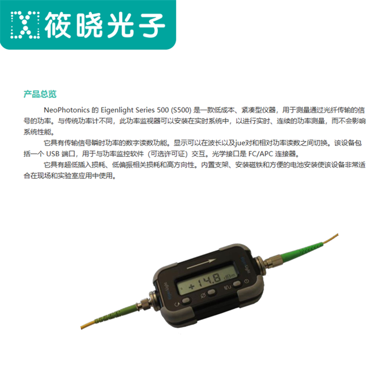 NeoPhotonics 的 Eigenlight Series 500 (S500) 是一款低成本、紧凑型仪器,用于测量通过光纤传输的信号的功率。与传统功率计不同,此功率监视器可以安装在实时系统中,以进行实时、连续的功率测量,而不会影响系统性能。