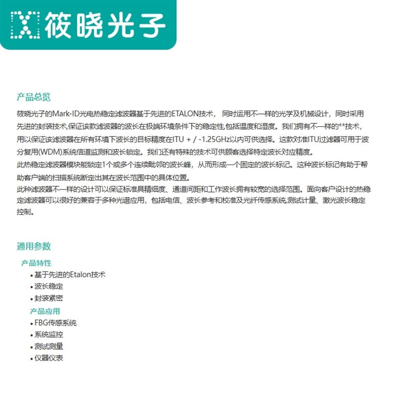 筱晓光子的Mark-ID光电热稳定滤波器基于优良的ETALON技术, 同时运用不一样的光学及机械设计,同时采用优良的封装技术,保证该款滤波器的波长在环境条件下的稳定性,包括温度和湿度。我们拥有不一样的**技术,用以保证该滤波器在所有环境下波长的目标精度在ITU + / -1.25GHz以内可供选择。这款对准ITU过滤器可用于波分复用(WDM)系统信道监测和波长锁定。我们还有特殊的技术可供顾客选择特定波长对应精度。