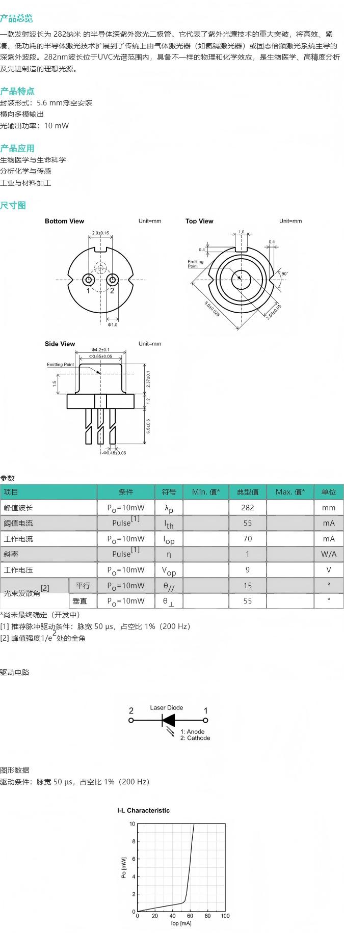 一款发射波长为 282纳米 的半导体深紫外激光二极管。它代表了紫外光源技术的重大突破,将高效、紧凑、低功耗的半导体激光技术扩展到了传统上由气体激光器(如氦镉激光器)或固态倍频激光系统主导的深紫外波段。282nm波长位于UVC光谱范围内,具备不一样的物理和化学效应,是生物医学、高精度分析及制造的理想光源。